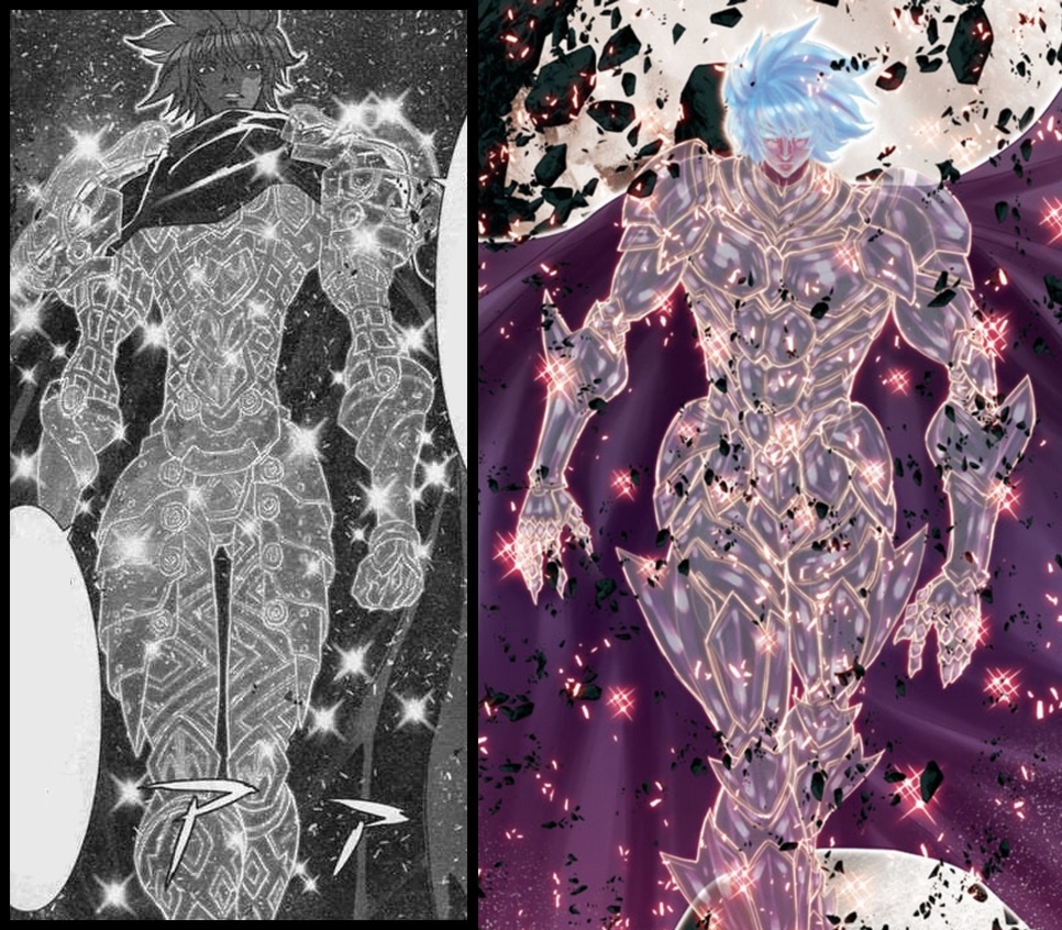 Chapitre 35 : La mer sombre et profondePage 1Ikki : …Ikki : Étrange…Ikki : J’ai totalement neutralité l’intrus.Ikki : Pourtant, je ressens toujours un Cosmos. Ou plutôt devrais-je dire…Page 2Ikki : … que je ressens un Cosmos en pleine expansion rapide.Ikki : Sa taille est sans commune mesure avec celui du Grigori.Ikki : Ce Cosmos est extrêmement puissant.Ikki : Je ressens des ténèbres abyssales.Ikki : Elles nous entourent.Page 3Ikki : C’est elle, la mer sombre et profonde… Pages 4-5Ikki : qui porte le même nom que le dieu de la mer…Ikki : Pontos.Page 6Pontos : Je l’ai enfin trouvée.Pontos : Elle était cachée…Pontos : … dans les profondeurs…Pontos : … de cette île enflammée.Pontos : Déesse Athéna.Pontos : Tu dois me montrer ton pouvoir.Pontos : Pour réaliser ma grande ambition…Pontos : … je dois savoir.Page 7Pontos : Je dois comprendre Athéna…Pontos : … avant que les autres dieux ne soient au courant de son existence.Gamin : Il pleut ?!Gamin : Ça éteint le feu ?!Gamin : Génial !!Iga : Non…Iga : C’est…Page 8Iga : … de l’eau de mer.Iga : Ce n’est certainement pas un phénomène naturel !!Iga : Saori !!! Tu le sens toi aussi ?!Sao : Oui.Sao : Clairement.Sao : Je suis écrasée par ce terrifiant sentiment d’intimidation.Sao : Ce n’est pas…Sao : … un Cosmos humain.Page 9Sao : C’est un Cosmos divin.Tatsumi : Waah !!Tatsumi : C’est quoi, une catastrophe naturelle ?!!Tatsumi : Ikkiii !!! Qu’est-ce que tu fabriques ?!Tatsumi : Ramène-toi fissaaa !!Tatsumi : Je flippe !!Page 10Responsable : Tout va bien.Responsable : Je vais y aller.Tatsumi : Hein ?!Tatsumi : C’est toi ?!Ikki : L’île entière est emplie…Ikki : … de Cosmos divin.Ikki : Puisque le nom de Grigori…Ikki : … désigne celui qui recherche les opposants aux divinités…Page 11Ikki : … alors tout ce qui se reflète dans ses yeux…Ikki : … doit également être accessible aux dieux. Dans ce cas…Ikki : … cela signifie que Saori a été découverte. Par conséquent…Ikki : … je dois la protéger coûte que coûte. Je suis le dernier Saint d’Athéna.Ikki : Ma vie ne peut que devenir le bouclier de tout ce qui est.Responsable : Ikki…Ikki : Qu’est-ce que tu fais ? Rentre.Ikki : Même si tu bénéficies d'une protection, c’est dangereux ici.Page 12Responsable : Je le sais bien. Malgré tout…Responsable : … je dois te parler.Ikki : Je sais ce que tu vas me dire.Ikki : Ne t’inquiète pas, je protégerai Saori. Sois rassurée.Responsable : Tu te méprends.Responsable : C’est toi qui m’inquiètes.Ikki : Moi… ?Page 13Responsable : Tu ne crains pas la mort. Cela signifie… Responsable : … que tu n’hésiteras pas à te sacrifier pour protéger Saori.Responsable : Mais tu sais, Ikki, cela n’a aucun sens.Responsable : Si tu meurs alors…Responsable : … sur qui Saori pourra-t-elle compter ?Responsable : Elle n’a pas encore retrouvé ses pouvoirs et ses souvenirs d’Athéna.Responsable : Durant ses trois ans de croissance…Responsable : … elle a été élevée dans la joie, tout en étant ébranlée par l’anxiété et les lamentations.Page 14Responsable : Peu importe combien cela est difficile, tu n’as eu de cesse de tout donner et de combattre pour Saori et les enfants.Responsable : C’est précisément parce qu’elle a vu cela en toi…Responsable : ... qu'à ses yeux, tu représentes tout ce en quoi elle peut croire. Cela va sans dire.Responsable : Pour cette enfant, tu es un être irremplaçable qui personnifie la justice.Ikki : Je n’en sais rien. Parce que je ne peux que combattre.Ikki: Qu’on parle d’hier ou d’aujourd’hui, cela n’a pas changé. Peu importe qui est mon adversaire… Même si c’est un dieu…Ikki : Mon devoir est de protéger Athéna.Ikki : Je suis le dernier Saint sur Terre.Ikki : Tout ce que je peux faire, c’est accomplir ma mission.Page 15Responsable : Dans ce cas… Responsable : … tu ne dois pas mourir.Responsable : Tant que Saori n’est pas devenue la véritable Athéna…Responsable : … tu dois continuer à la protéger.Responsable : Tu dois devenir le phare de la nouvelle justice qui va naître.Responsable : Tu dois survivre non seulement pour les nouveaux Saints à venir...Responsable : ... mais aussi pour tous ceux qui reviendront.Responsable : Ikki, tu n’es pas le dernier Saint.Page 16Responsable : Tu es au contraire le premier Saint…Responsable : … à être apparu sur Terre.Responsable : Tu as pavé une voie de justice que tous les Saints suivront…Responsable : … pour se rassembler auprès d’Athéna.Page 17Ikki : Tu parles beaucoup, mais c’est d’accord… Je vais t’écouter aujourd’hui. Pour la suite…Ikki : … laisse-moi faire.Responsable : Je te remercie, Ikki.Responsable : Tu lui ressembles vraiment, tu sais.Responsable : Tu ne te préoccupes pas de ton sort.Responsable : Tu n’as pas peur d’être blessé… Responsable : … pour protéger ceux qui te sont chers.Responsable : C’est parce que tu es ainsi…Responsable : … qu’il a décidé de te confier tout ce qu’il avait.Responsable : Puis les étoiles t’ont choisi.Page 18Responsable : Tu es devenu un Gold Saint… Celui du Lion.Responsable : C’est ainsi que tu as hérité de la Cloth du Lion (elle utilise le mot japonais et pas latin). Et c’est une bonne chose.Ikki : … Ton maître, Aiolia, était…Ikki : … un véritable héros. Je ne pense pas être digne de lui succéder car je ne sais qu’éliminer des gens.Ikki : Mais, s’il s’agit du destin, alors je ferai ce que je peux.Ikki : Tu peux croire cela.Ikki : Lithos.Page 19Iga : La mer se soulève et se maintient sur place ?!Iga : … Mais… qu’est-ce que ça veut dire… ?!Iga : C’est un humain ?Gamins : Sao !! J’ai peur !!Gamins : Qu’est-ce qu’on fait ?!Sao : Allons, les amis.Sao : Ça va aller !!Page 20Sao : Je vais tous…Sao : … vous protéger !!Iga : Qu’est-ce que tu racontes ?! Tu dois f