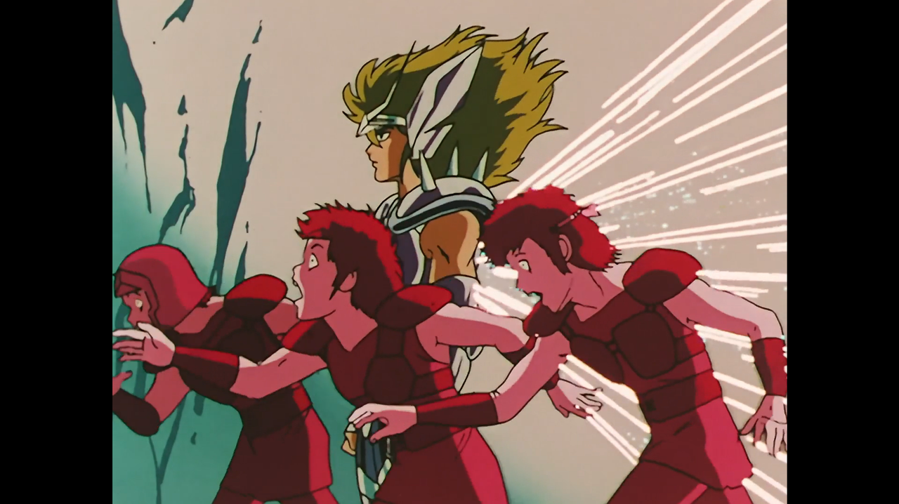Cette scène est très similaire à celle dans Lady Oscar où le duc de Chartres veut punir violemment un enfant, puis fait semblant de se raviser avant de lui tirer dans le dos. Un code très classique pour montrer qu'un méchant jouit de son pouvoir. Abuser de la "naïveté" de quelqu'un au lieu d'y aller directement, c'est bien ce qui se passe. La Toei comme TMS ont identifié le gentil (Oscar/Aiolia) et les méchants (Le Duc/Algol & Shaina). 9